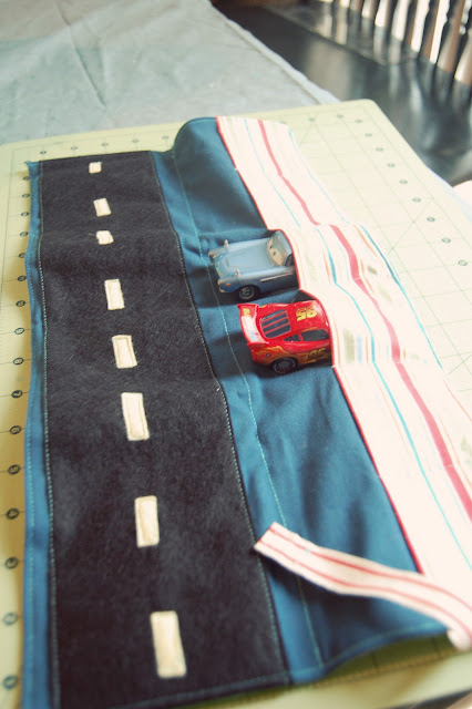 O xadrêz preto e branco foi minha proposta de "linha de chegada, ao fim, para ficar com cara de pista mesmo, troquei para linha branca e bordei com um ponto zigue-zague bem fino, quase no zero, as divisões:
